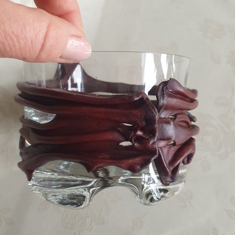 Vacker handblåst vas i konstglas med dubbla handtag. Opaliserande glas med bärnstensfärgade detaljer. Osignerad.