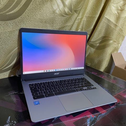 Acer Chromebook 314 bärbar dator med standardtangentbord och pekplatta. Enheten har en skärm med inbyggd webbkamera och är utrustad med en AMD-processor. Den är lämplig för allmän användning och dagliga datoruppgifter.