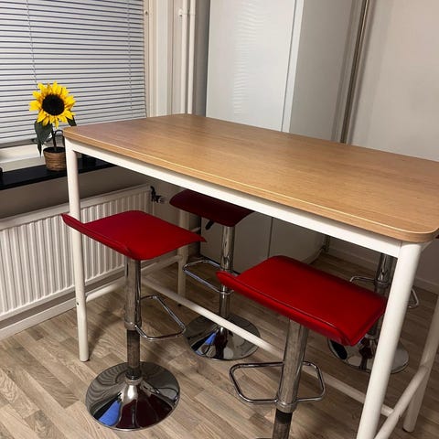 Jysk barbord med hyllor och Ikea hopfällbara barstolar