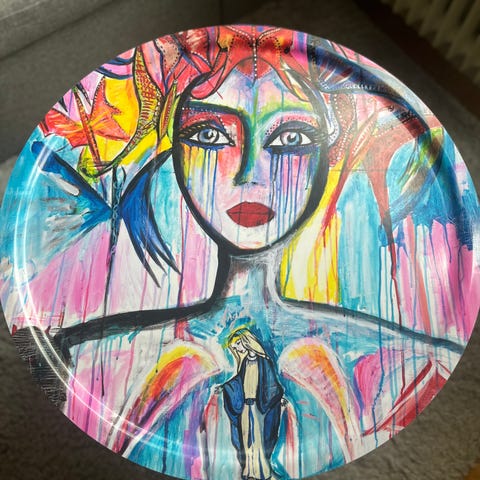 Set om två sidobord med brickor med färgglada konstnärliga motiv. Brickorna är runda och har motiv av ansikten i abstrakt och färgstark stil. Stativet är av metall med en guldig finish och har en enkel, minimalistisk design. Gynning design , original stativ och brickor