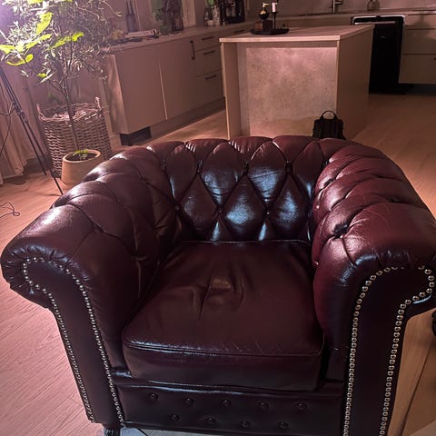 Skinnfåtölj som är skön att sitta i med två lägen.