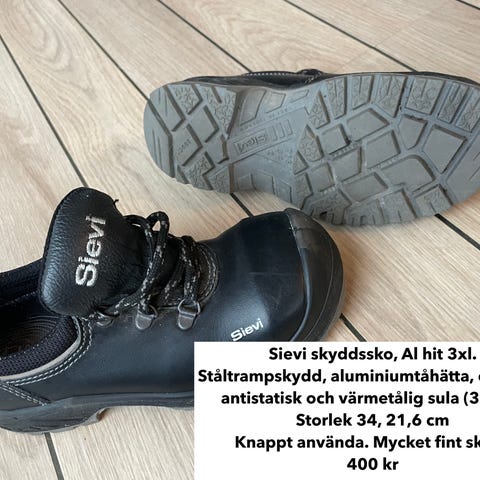 Sievi skyddssko Al hit 3xl. Sultrampskydd, aluminiumtåhätta, antistatisk och värmetålig sula. Storlek 34, 21,6 cm. Mycket fint skick. 400 kr