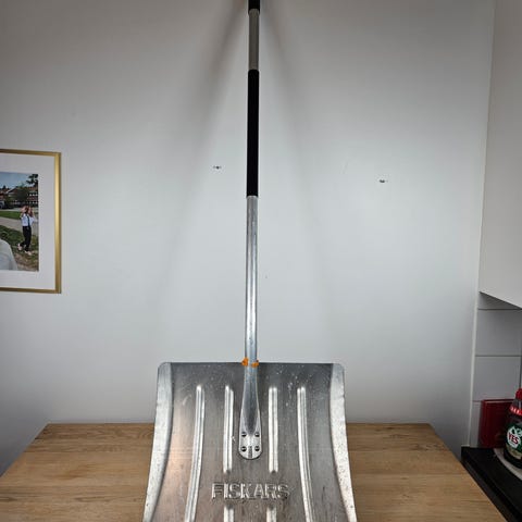 Snöskyffel med brett blad och metallhandtag. Används för att skotta snö och underlätta borttagning av snö från gångvägar och uppfarter.