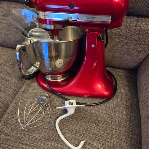 Hej! Säljer en fin Kitchen aid, har haft den i ungefär 4 år men inte använt den särskilt ofta så den är i väldigt bra skick, är dock ett litet märke på en av krokare men inget som påverkar den alls.
