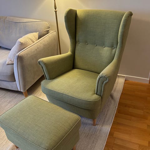 Ikea Strandmon fåtölj med fotpall i mörkgrön färg.