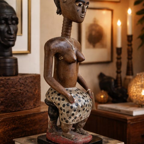 Unikt, handhugget afrikanskt träobjekt med ursprung i Västafrika, troligen från Asante- (Ashanti) eller Chokwe-folken.– en dubbel mortel/behållare med två urholkningar upptill och dekor i form av djurhuvuden i ändarna. Mycket starkt uttryck och fin, torr patina med tydliga spår av ålder och användning. Passar perfekt som tribal art/etnografika, samlarobjekt eller som exklusiv inredningsdetalj på sideboard, konsolbord eller i bibliotek.