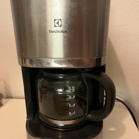 Electrolux kaffebryggare i rostfritt stål och svart plast. Utrustad med glaskanna och kontrollpanel med knappar för bryggning. Passar för hemmabruk eller kontor.
