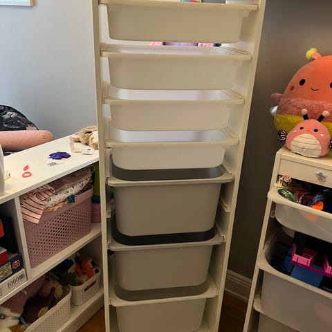 IKEA Trofast förvaringsbänk med tre transparenta plastlådor. Mått: 99 cm bredd, 64 cm höjd, 42 cm djup. Färgen är vit. Förvaringslösning lämpad för organisering av leksaker eller andra småsaker.