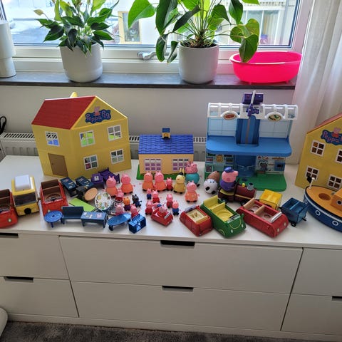 Greta Gris lekset som inkluderar en röd bil och flera figurer från serien. Figuren är tillverkade i plast och är anpassade för barnlek.