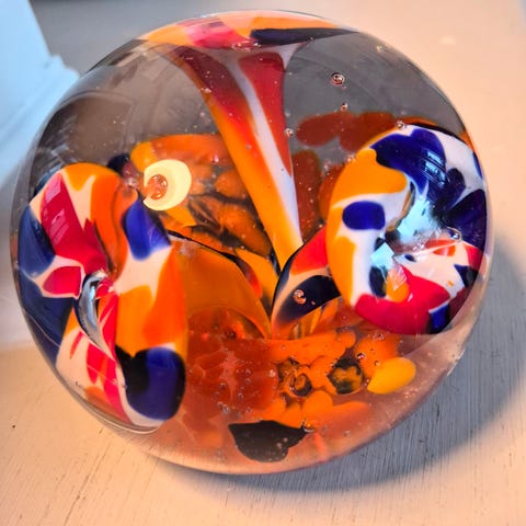 GLASPRESS BREVPRESS SKULPTUR 1960 TAL RETRO VINTAGE FIGUR STATY ORANGE GLAS