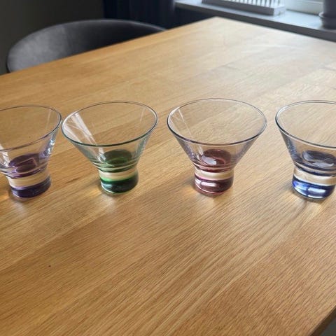 4 st ouppackade martiniglas från Sagaform, design Club av Matz Borgström. Vardera har blå, rosa, grön och orange fot.