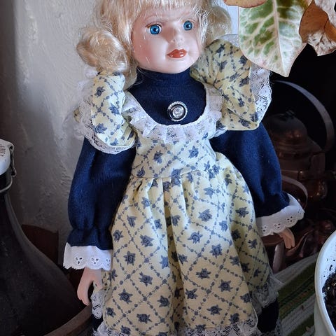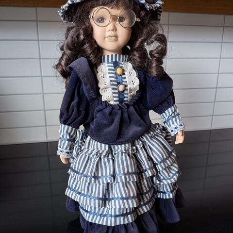 En docka klädd i en brun-rutig klänning med svarta detaljer och en svart-vit scarf. Dockan har långt, lockigt blont hår och svarta skor. Passar som samlarobjekt eller leksak.
