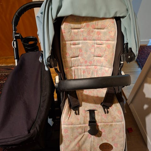 Hjulen är utbytta i slutet utav 2025. Ny sufflett köpt 2025 (man får med en äldre sufflett i samma färg). Sidokorgen är en ifrån en donkey 3 (med dragkedja). Alla tyger är i grey melange. Man får med sittdel och liggdel.