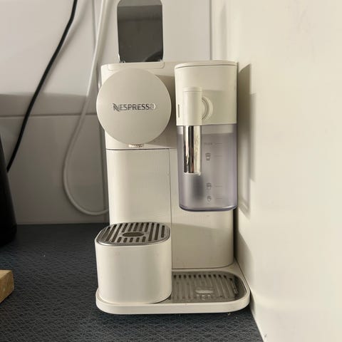 Nespresso Lattissima One espressomaskin med integrerad mjölkskummare. Maskinen har en kompakt design med svart och vit färg. Utrustad med avtagbar mjölktank och vattenbehållare. Passar för att brygga espresso och skumma mjölk för olika kaffedrycker.