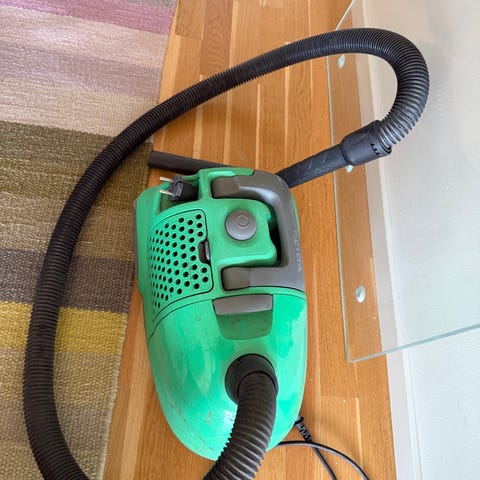 Retrodammsugare från Dyson. Påsfri och därmed enkel att använda och tömma. Synligt använd men fungerar fint. Vid intensiv användning lägger den ibland av, men funkar igen om den får vila 5-10 min.