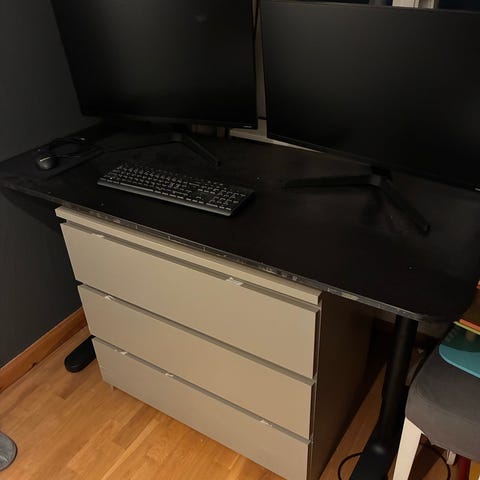Säljer ett höj och sänkbart skrivbord från ikea. Bordet är i bra skick och går att höjas med vev. Slitage syns på bild två.
