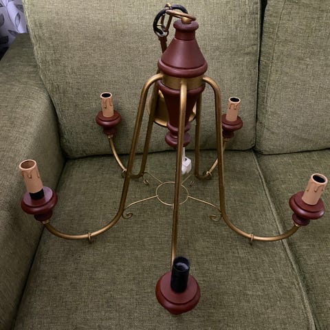 Det finns en liten skada på tygsladden precis vid mässingsarmen. Annars i fint skick.