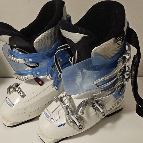 Varma, sköna alpina pjäxor för nybörjare, medel. Sparsamt använda (se bilder)! Storlek:255. Jag har storlek 39 och de har passat utmärkt. Färg:antracit/nero