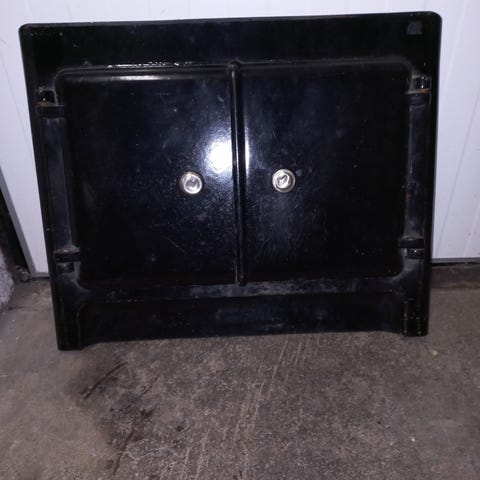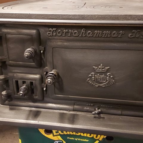 Gjutjärnslucka som sitter under vedspis i bra skick för vedförvaring eller förvaring för kastruller och stekpannor