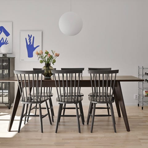 Klassisk pinnstol i trä med slitstark, lättskött yta.