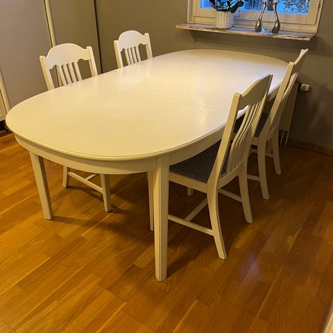 Säljer ett matbord med 4 stolar. Inläggnings skiva finns.