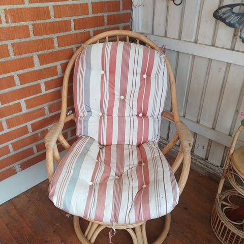 Trädgårdsmöbelset bestående av flera rottingstolar och ett bord. Möbelsetet har beige dynor och är avsett för utomhusbruk på balkong eller terrass.