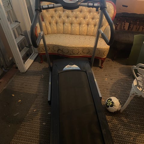 Reebok Treadmill löpband i svart färg. Utrustad med digital display och kontrollpanel för inställning av hastighet och träningsprogram (5000 kr)samt en äldre träningscykel (500 kr). Passar för hemmabruk och konditionsträning