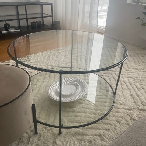 Ovalt soffbord med svart yta och metallben. Bordet har en enkel design med en slät, svart bordsskiva och fyra svarta metallben med justerbara fötter. Passar för vardagsrumsmiljöer och kan användas som soffbord eller sidobord.