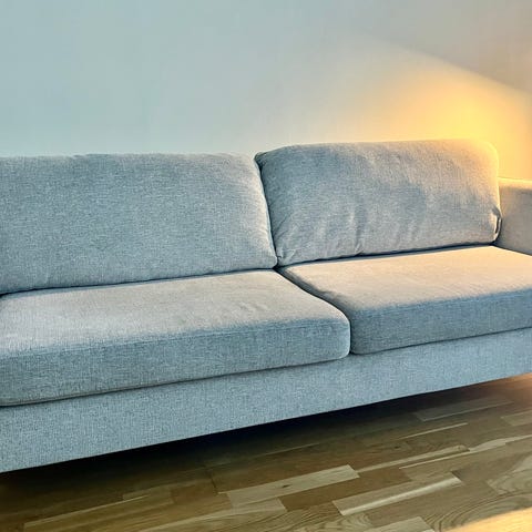 Soffa Nevada 3-sitsig från Mio som har några småfläckar samt en större fläck på armstödet åt vänster i bilderna. Den ska gå att få bort, men har inte tagit tag i det själv. Den tillkom när jag strök kläder på den.