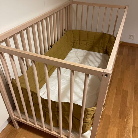 IKEA barnmadrass i grått material. Madrassen är hopfällbar och har flera lager för komfort och praktisk förvaring. Passar som sov- eller viloplats för barn.