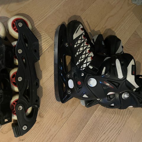 Barnskridskor i storlek 31, avsedda för rullskridskoåkning. Skorna är vita med detaljer i flerfärgat mönster. Utrustade med fyra hjul per sko, hjulstorlek cirka 54x32 mm. Designade för barn.