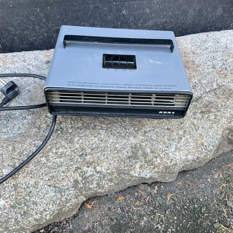 Värmefläkt i vit färg med bärhandtag och två reglage för inställning av värme och fläkthastighet. Utrustad med strömkabel för anslutning till eluttag. Passar för uppvärmning av mindre rum.