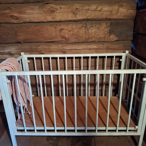 Barnsäng, spjälsäng i gulaktig färg. Slitage finns. Finns I Frövi.