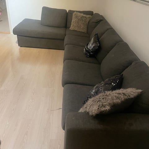 Hörnsoffa i grått tyg med plats för tre sittande personer. Soffan har löstagbara sitt- och ryggkuddar och träben. Passar för vardagsrum eller loungeutrymmen. Tyget går att tvätta.
