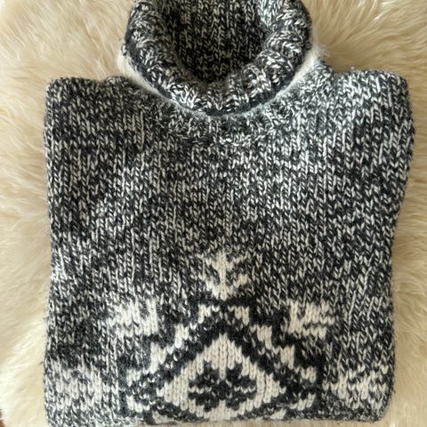 Stickad tröja i svart/vitt med nordiskt mönster. Klassisk rund hals och ribbade muddar. Varm och mjuk – perfekt för höst och vinter. Använd sparsamt och i fint skick, inga synliga defekter. Säljes p.g.a. garderobsrensning.
