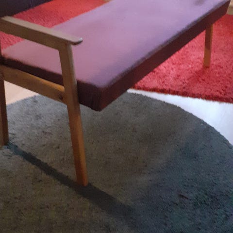 Träsoffa med blommigt tygkläde