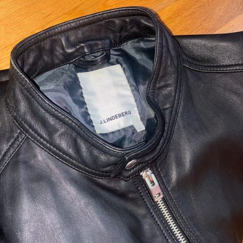 J. Lindeberg L Jacka i mörkbrunt läder för herrar. Jackan har en innerfoder av 100% polyester satin i ljusgrönt. Storlek L.