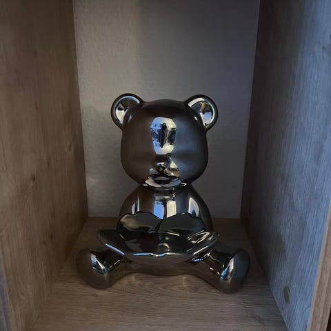 Stor och gosig brun nallebjörn, klädd i en handgjord stickad kofta och byxor i vinröd. Björnen är mjuk och kramgo. Perfekt som inredningsdetalj. Björnen brukade morra, men tyvärr gör den inte det längre.