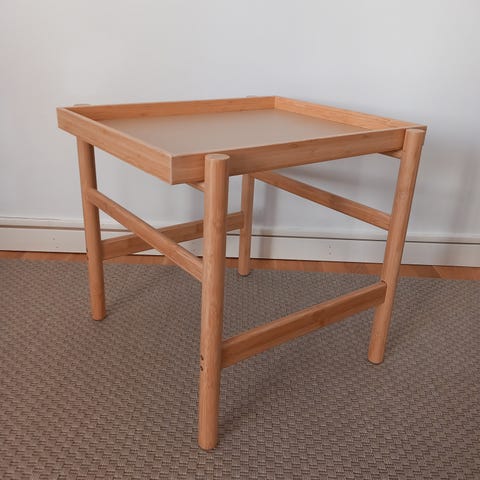 Hörnbord i trä med tre hyllor och en låda. Möbeln är tillverkad i trä och har en naturlig träfärg. Passar för förvaring. Inbyggt lönnfack finns.