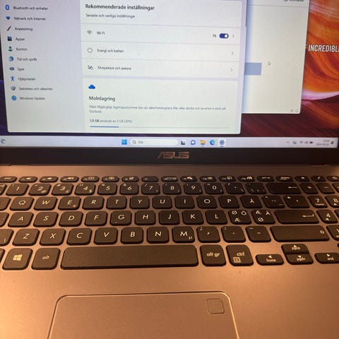 Asus bärbar dator med bakgrundsbelyst tangentbord och en skärm som visar Windows operativsystem.