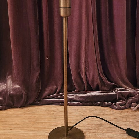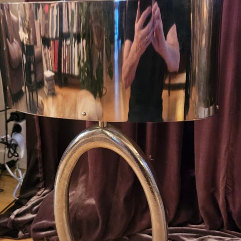 Bordslampa SIA, fot i aluminium med vit tygskärm. Total höjd 62cm, skärmens duameter är 39cm.