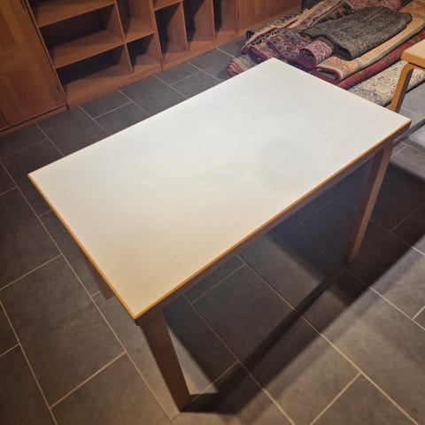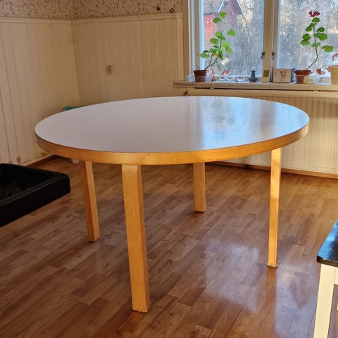 Jättefint runt bord från Departementet Astructure. Höj och sänkbart. Litet, litet märke på den vita skivan. Nypris 5500 kr.