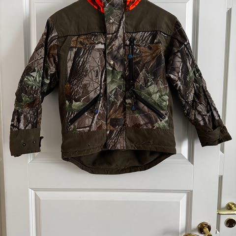 Jackan är hel och fin. Det som är att anmärka är att det finns små obetydliga fläckar (se bild) bl.a. på vänster ärm. Troligen har jag gått emot något färgat. Man tänker knappt på det. Finns även på ryggen men försvinner helt i kamomönstret.