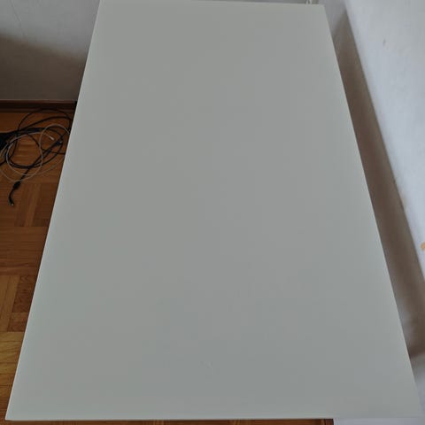 Vitt skrivbord från IKEA med hål för kablar. Låda för förvaring.