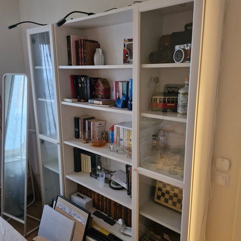 IKEA Billy bokhylla med glasdörrar i vit färg. Bokhyllan har flera hyllplan och är lämplig för förvaring och visning av böcker och andra föremål.