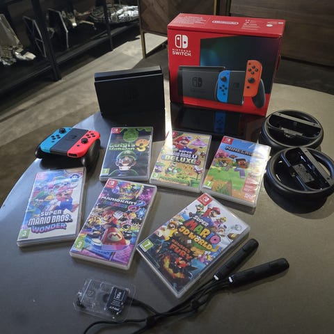 Nintendo Switch spelkonsol med handkontroller och röd bärväska. Konsolen har Joy-Con-kontroller i grå färg.