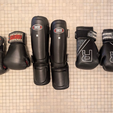 Jag säljer ett par boxing handskar, MMA handskar, benskydd, knäskydd, pung skydd, wraps och en träningspåse till.