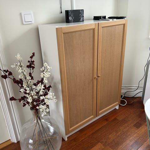 BILLY Skåp med OXBERG vitrinskåpsdörr säljes. Skåpet är varsamt använt och kommer med 5 hyllplan. Väggfästena sitter fastskruvade diskret på ovansidan, men kan plockas bort.