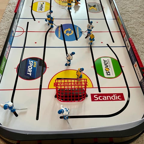 Stiga bordshockey i bra skick. Sverige- Finland. Lite defekt bordsfotboll spel. Saknas 1 gubbe och en del saknas för att flytta en gubbe. Men går fixa. Följer med på köpet av hockeyspelet.