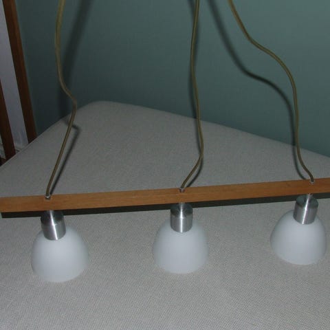 Snygg taklampa i metal och glas. Fyra ljuskällor. Lampan hänger i två vajrar som är justerbara i längd.